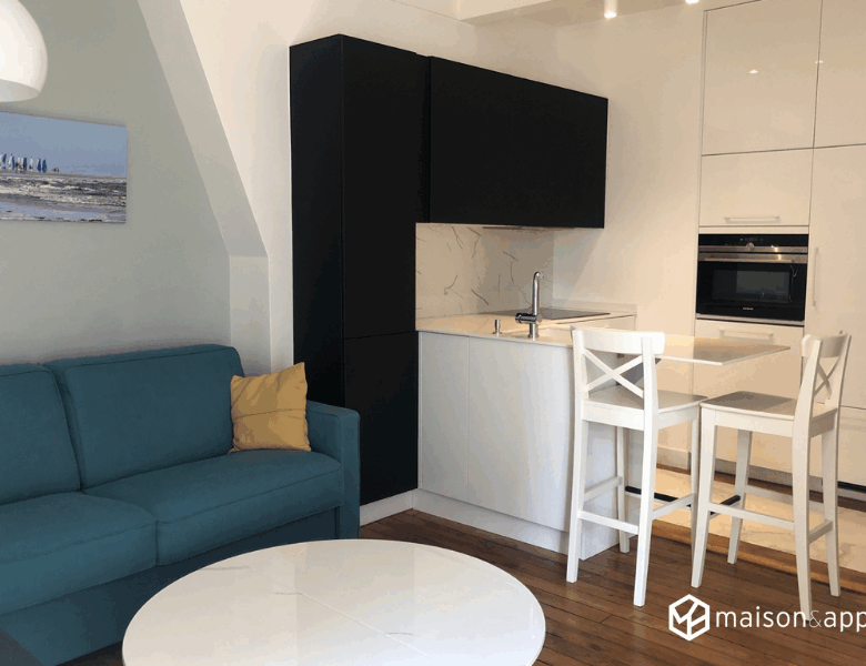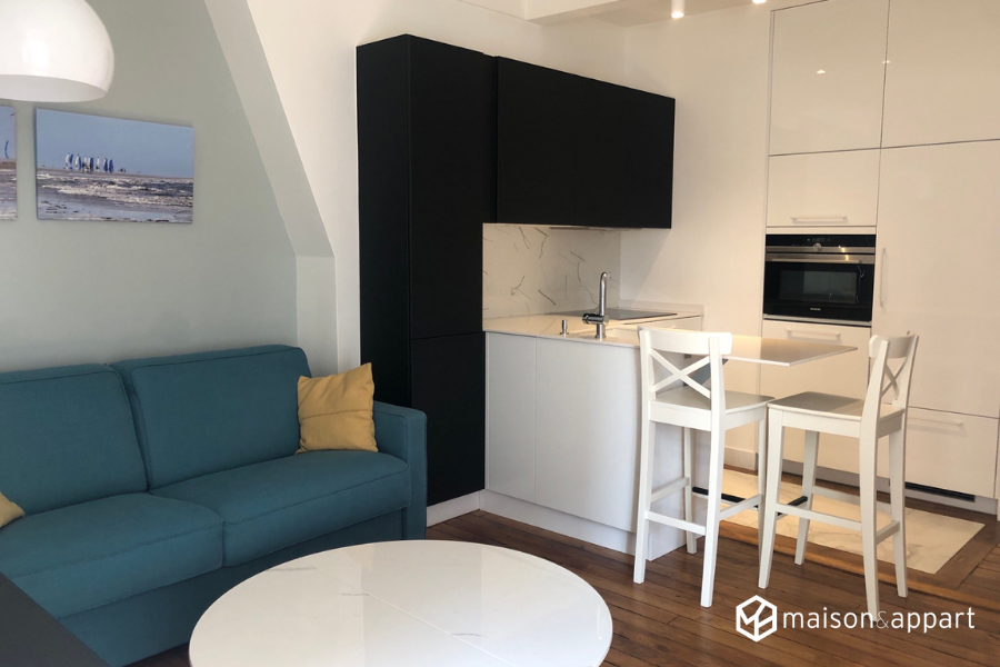 Vous y trouverez un séjour spacieux et raffiné, une chambre confortable avec rangements, une cuisine américaine entièrement équipée et une salle d’eau moderne.
